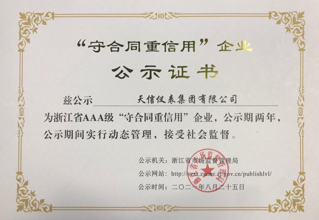 浙江省AAA级“守合同重信用”企业证书