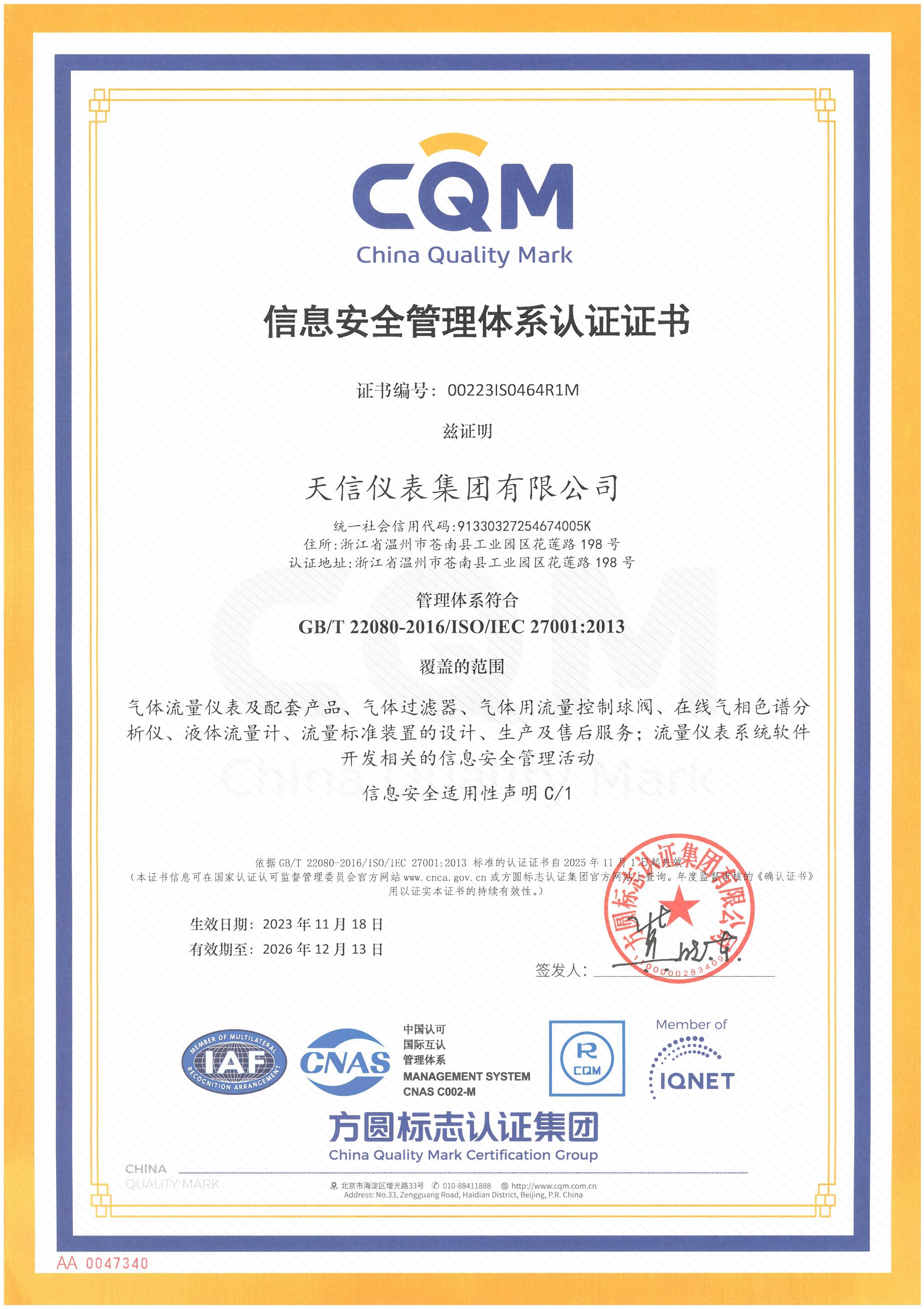 • 信息安全管理体系证书